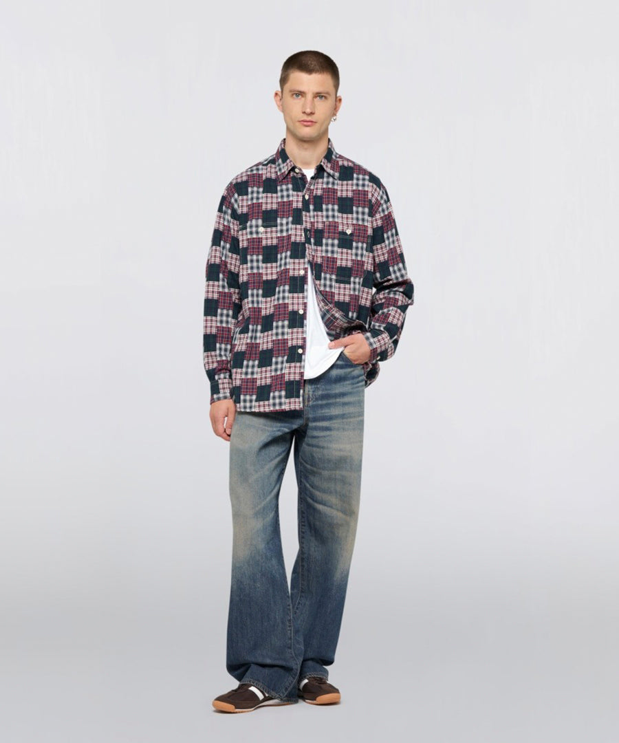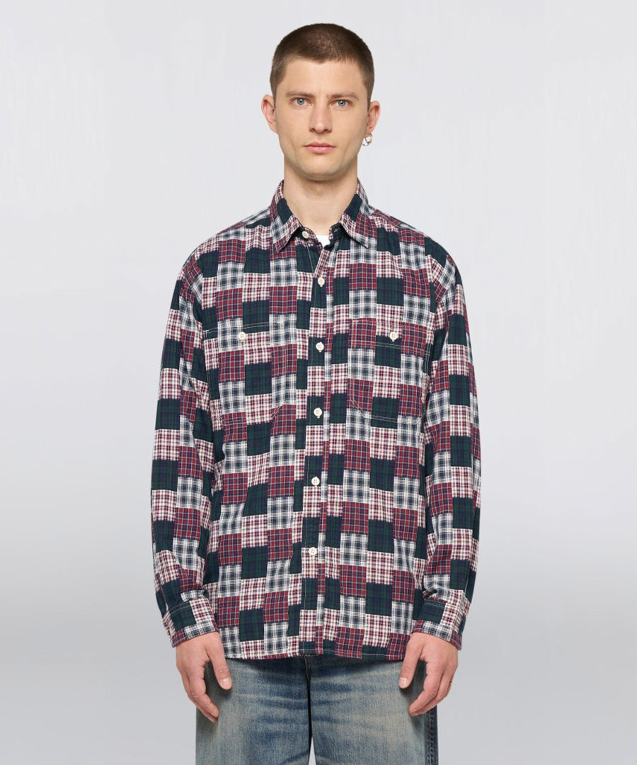 Striking workshirt in random patchwork dobby fabric from Edwin with a vibrant green/red color scheme. Made of 100% cotton with a garment washed finish that gives a soft, used feel and authentic workwear character from the first wear.