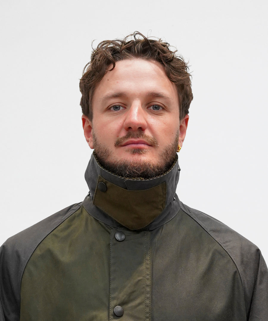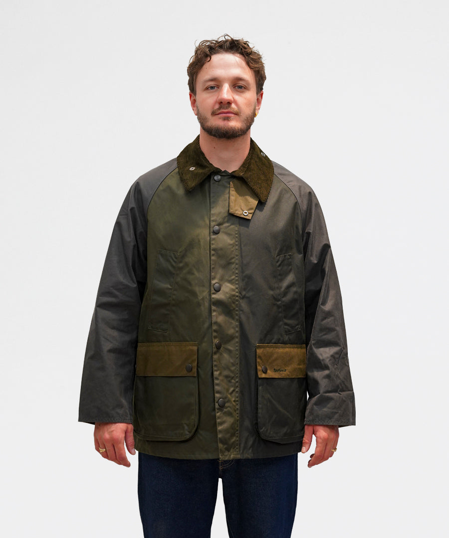 Den unikke Barbour Patchwork OS Bedale wax jacket i sage multi farver. Denne særlige version af den ikoniske Bedale jakke kombinerer forskellige wax cotton paneler i et moderne patchwork design.