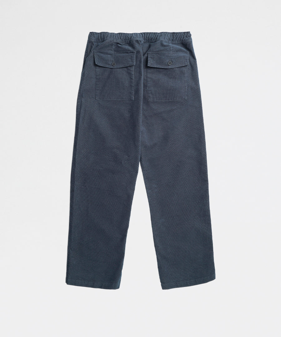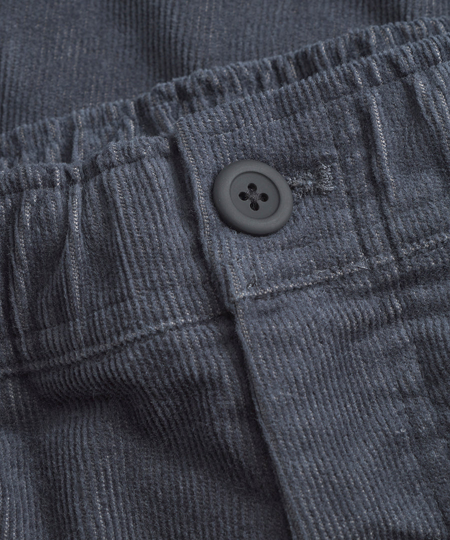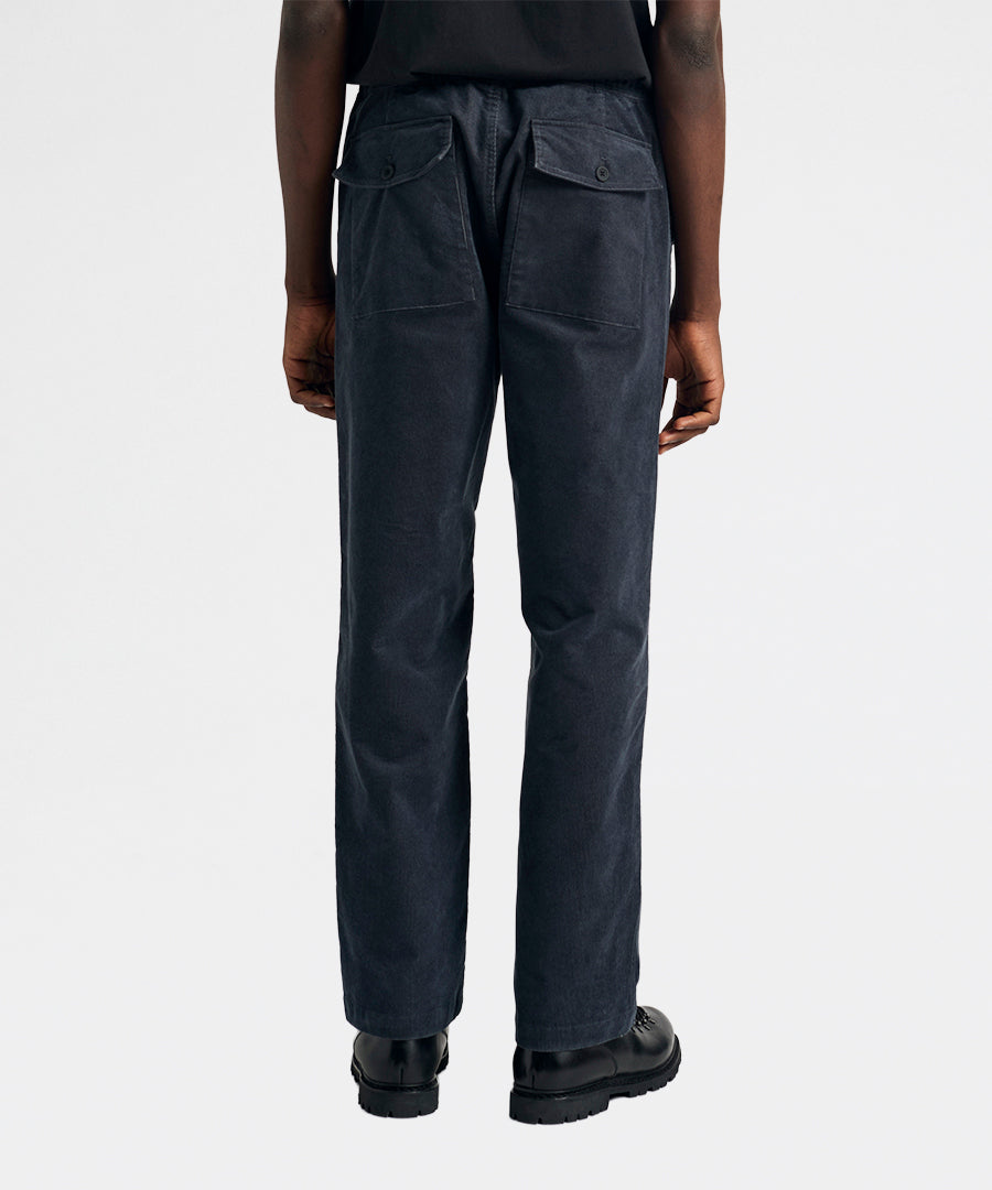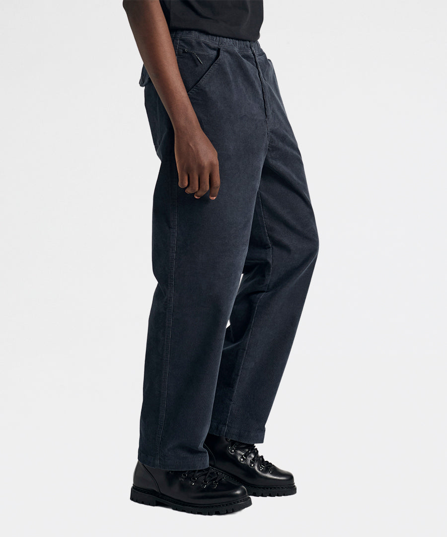 En afslappet pasform elastikbukser med vide ben, konstrueret i japansk Solotex corduroy og garment dyed for en dyb farve. Snørebånd sidder på indersiden af taljen, designet til at blive justeret og skjult væk. Har fatigue-stil lommer foran og bagpå, lynlås, knaplukning og mærket fane bagpå.