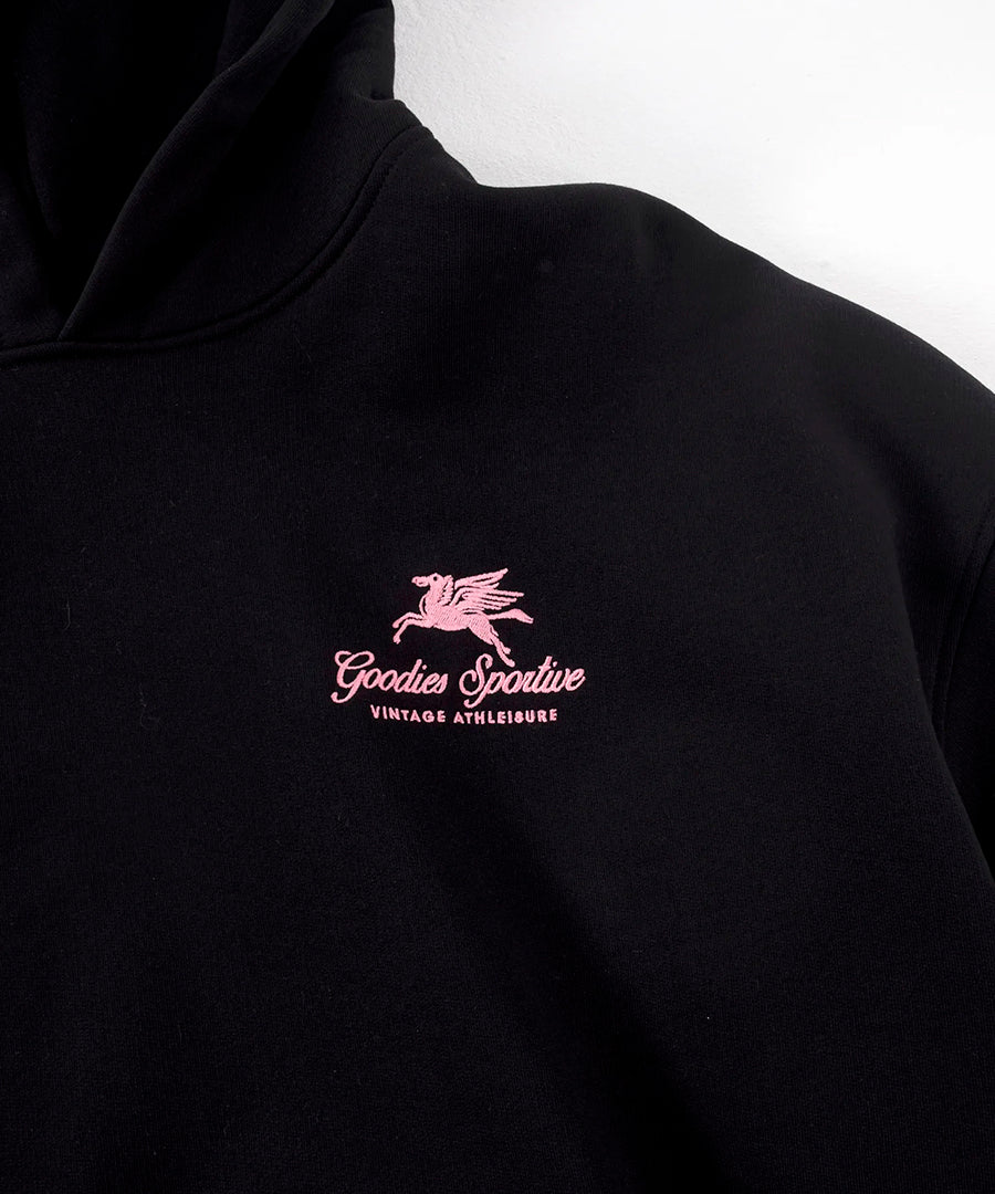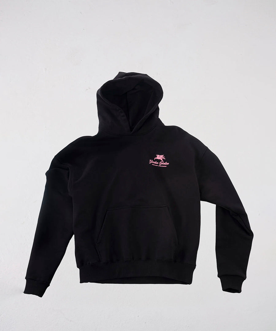 This premium hoodie, from the Goodies Sportive FW25 collection, is made from 550g heavy cotton, ensuring both warmth and durability. The hoodie features a classic hood with drawstrings and a practical kangaroo pocket on the front. The pink contrast embroidery on the left chest adds a stylish touch to the otherwise minimalist design. The product is carefully made in Portugal from 100% cotton and combines comfort with high quality in a timeless design.