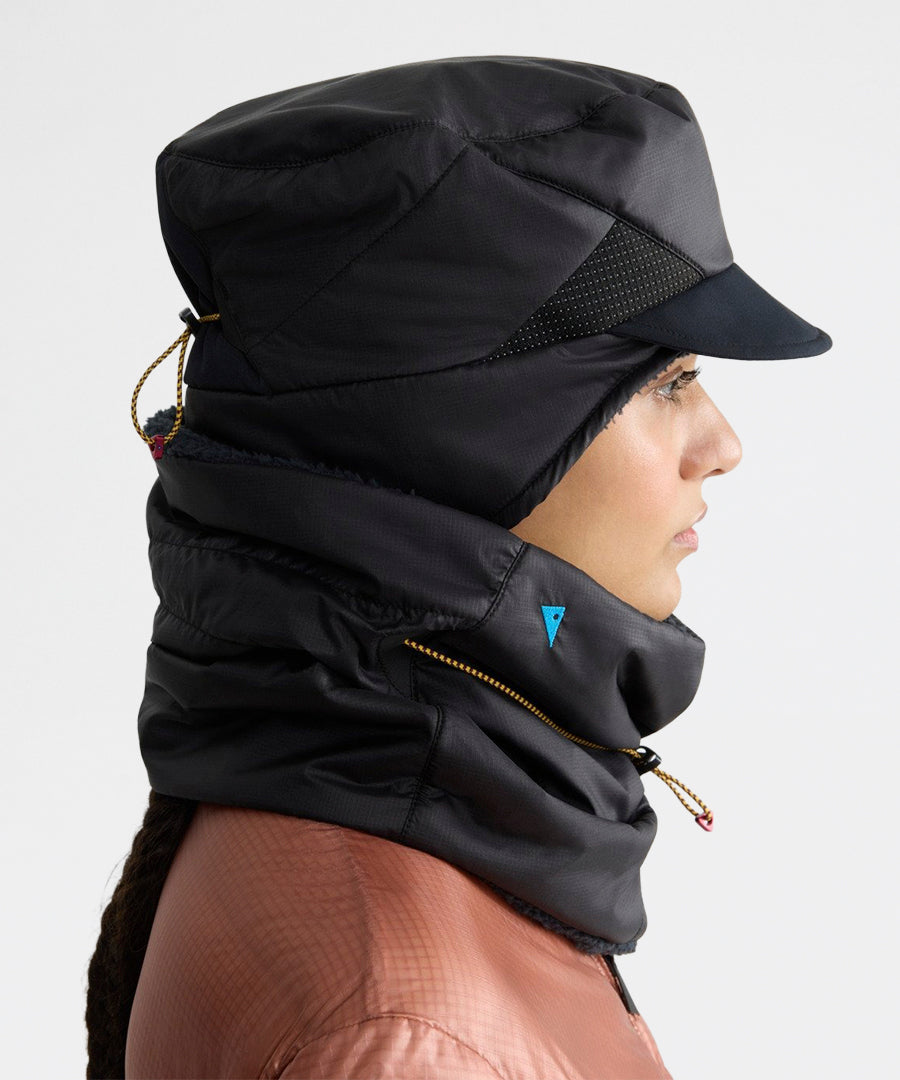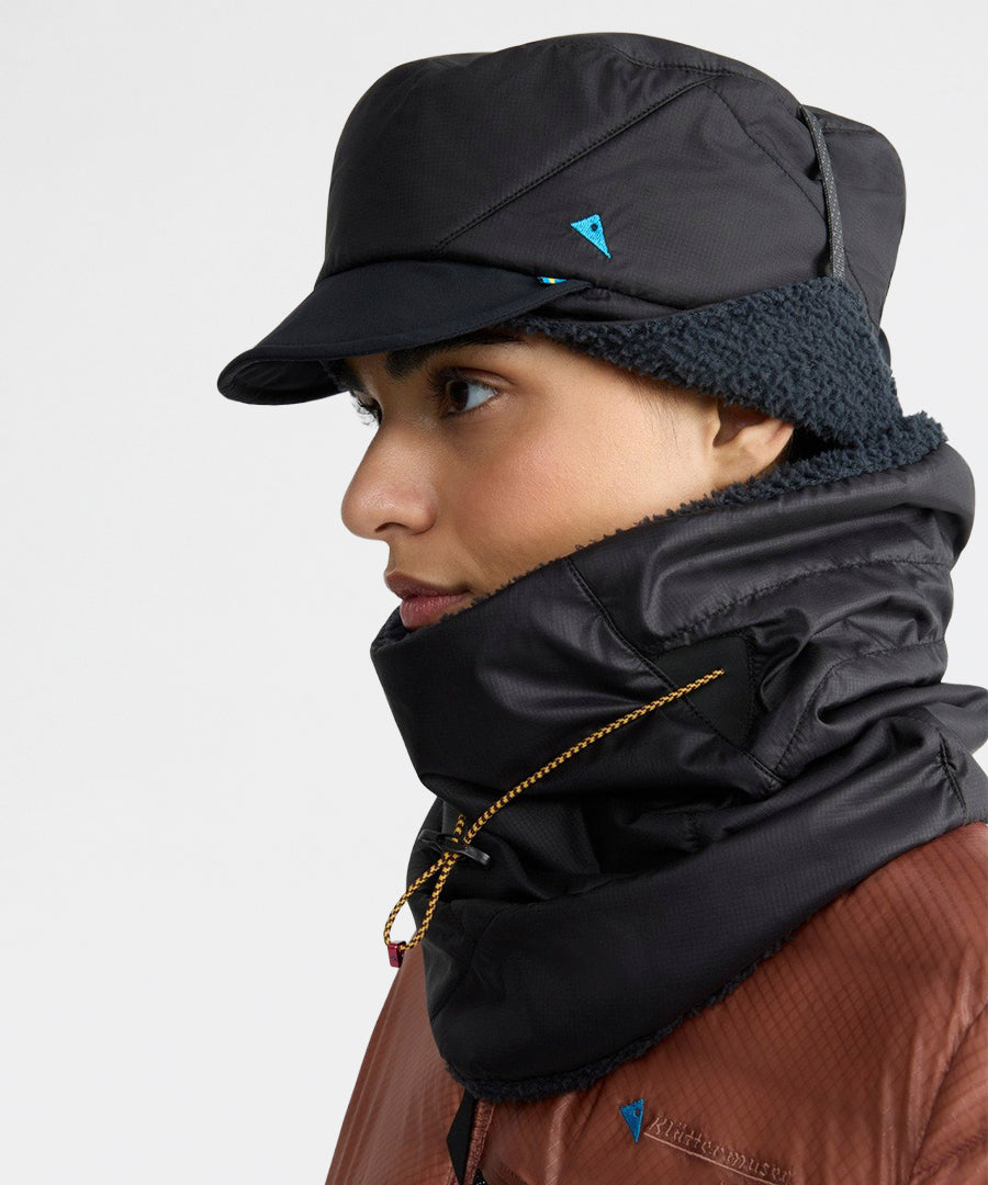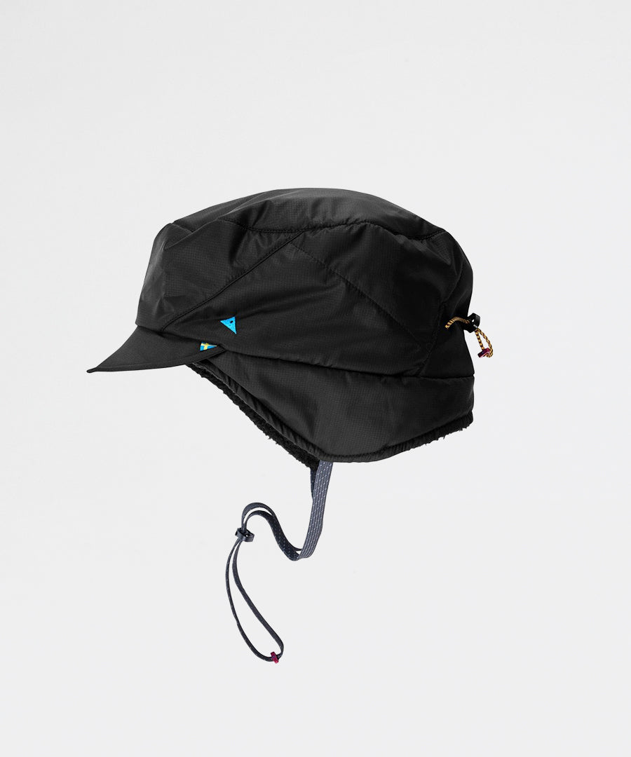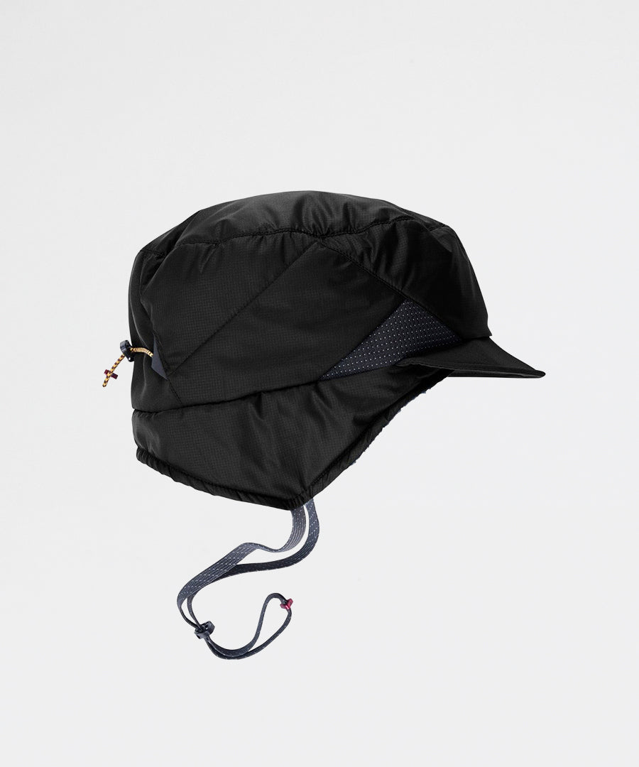 The Ide Hat is a lightweight yet durable mountaineering hat insulated with PrimaLoft®. Made from tough mini ripstop fabric, it has reinforced panels on the brim and back for extra durability. Insulated with 40 g PrimaLoft® Gold on top and 60 g on the sides, plus a soft PrimaLoft® high loft lining inside, it keeps your head warm even in the coldest conditions. All main materials including face fabric, lining, padding, and sewing thread are 100% recycled polyester. The hat features foldable earflaps that can be secured under the chin for a snug fit, an adjustable bungee cord at the back, and a soft protective brim with a metal wire inside for shaping.