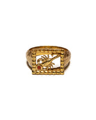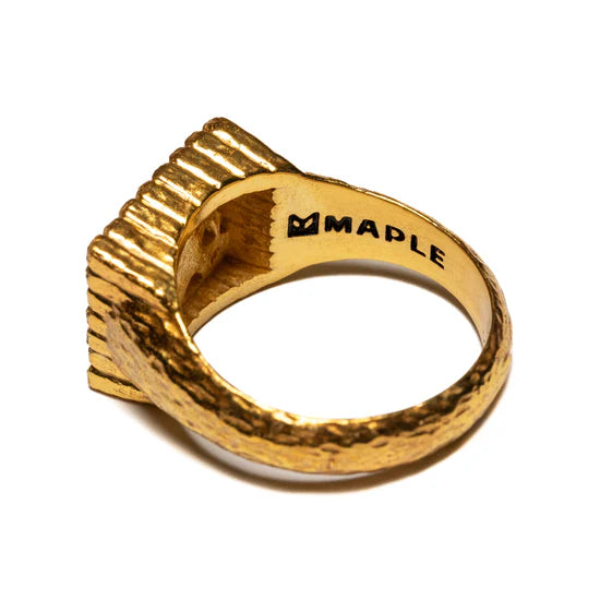 The Scorpio signet features a 3D scorpion clutching an orange Zircon diamond cut stone, a window to the skin, and a textured frame. Silver 925 construction with 14k gold plating, MAPLE logo, and hallmarking inside.