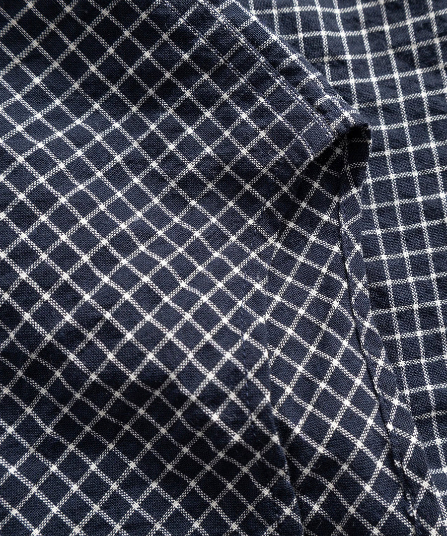 Espevik Oversized Check SS Shirt i Dark Navy Check er en kortærmet skjorte med et afslappet, oversized snit der sidder rigtigt fra første gang. Stoffet er en garnfarvet, struktureret bomuldsblanding med et klassisk ternet mønster — vævet i Italien og syet i Portugal.
