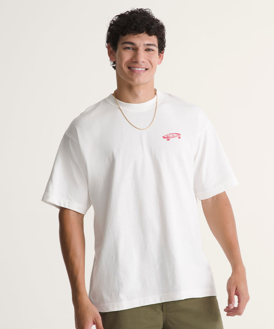 The Full Deck Tshirt Egret White from Vans is a classic t-shirt in the warm, off-white hue of egret. The name Full Deck refers to the skateboarding culture where Vans has its roots, and delivers an authentic streetwear aesthetic.