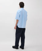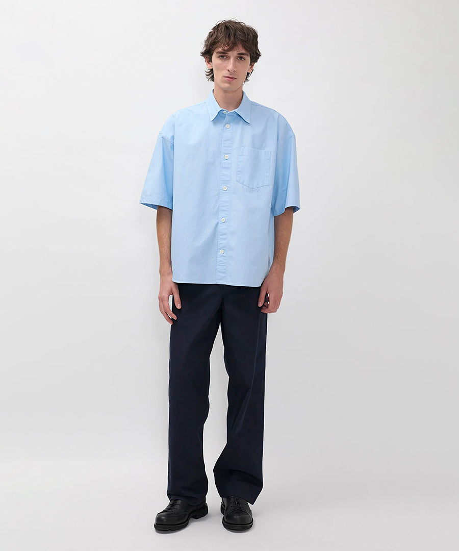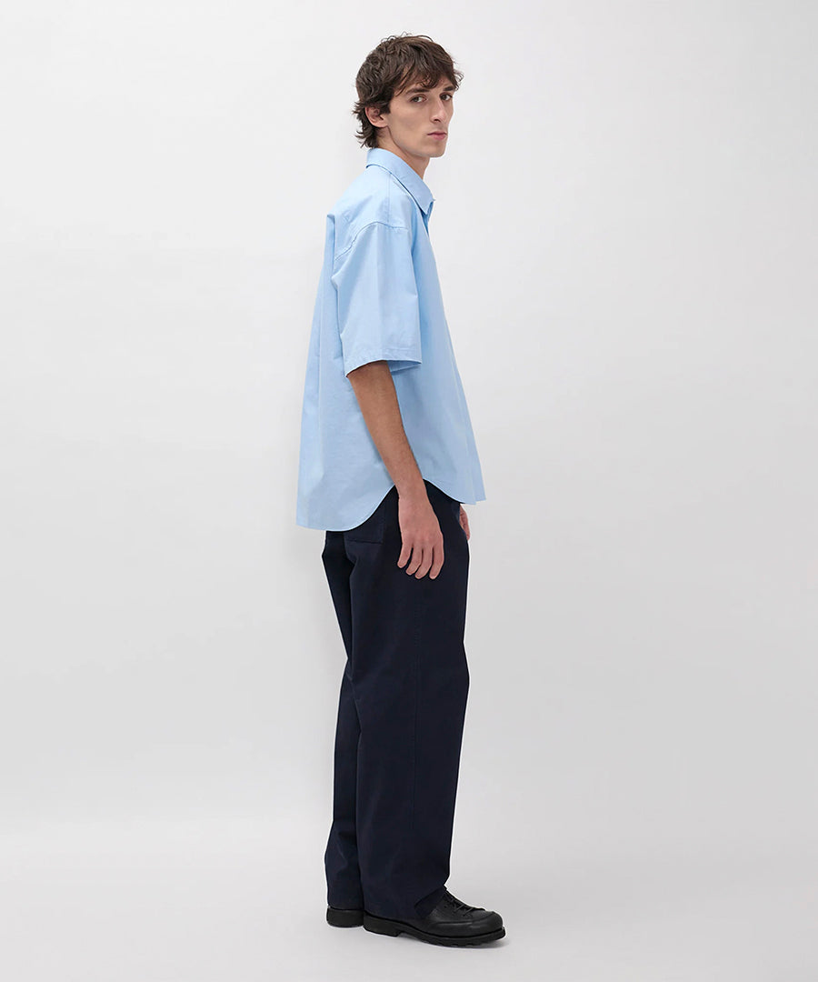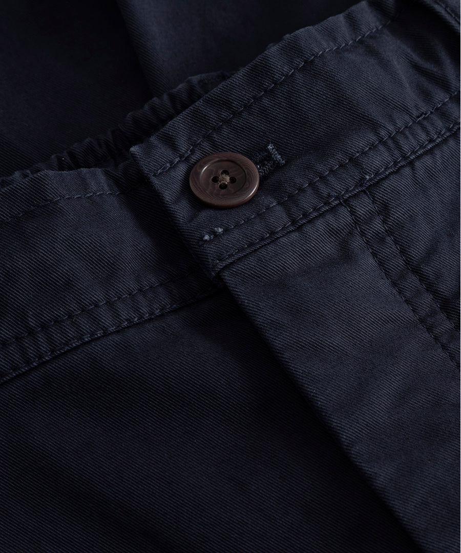 A relaxed wide-leg trouser with an elasticated waist, constructed in lightweight twill and garment dyed for a deep colour. Drawstrings sit on the inside of the waist, designed to be adjusted and hidden away. Featuring sharp slant pockets at the front and fatigue-style back pockets, a zip and button fastening.