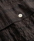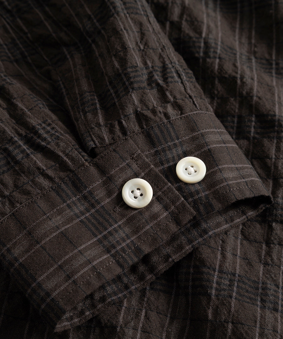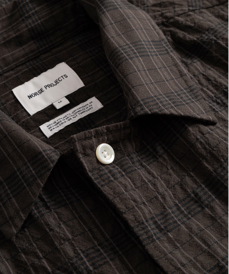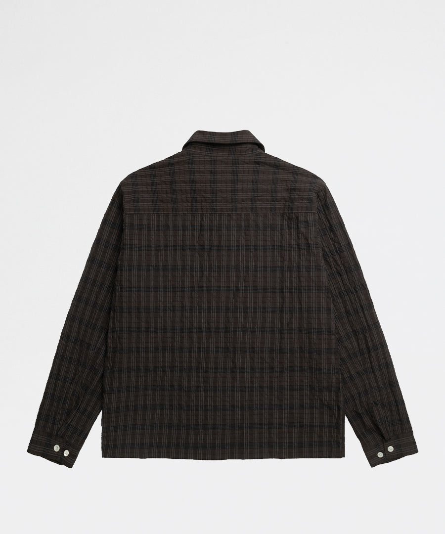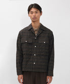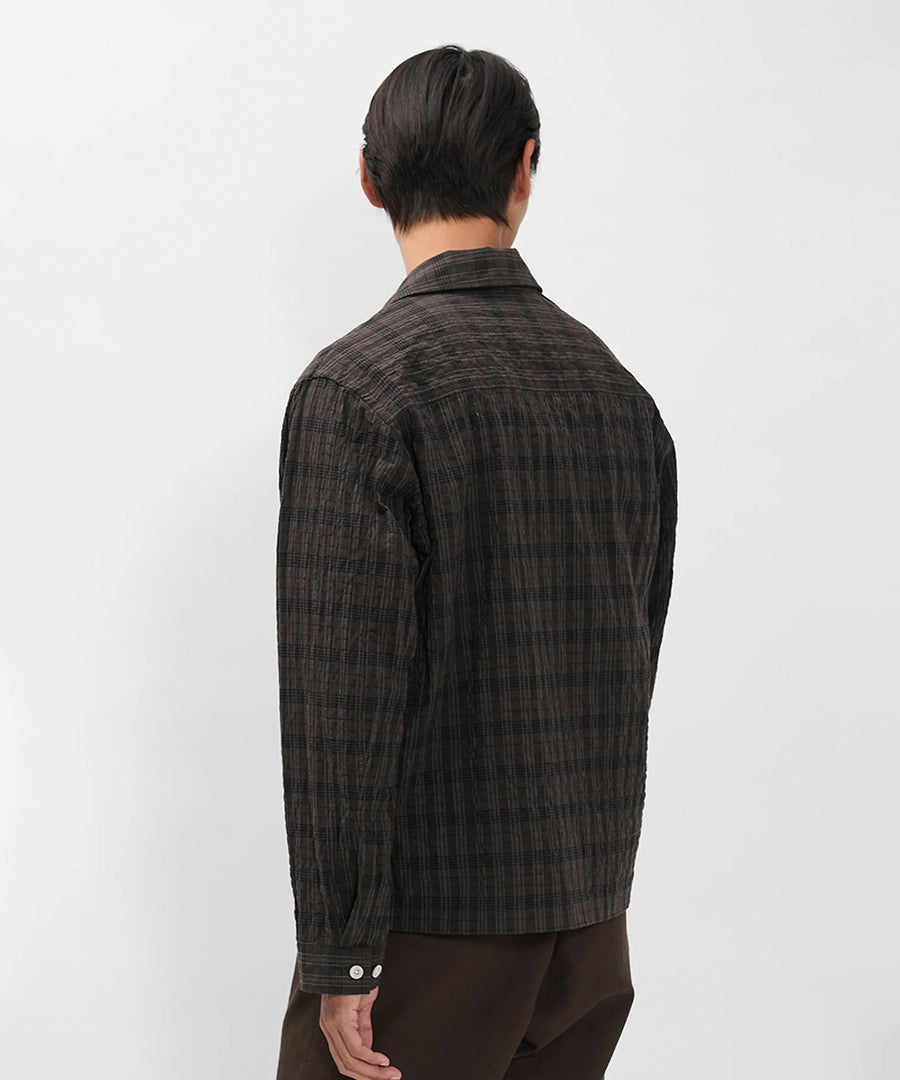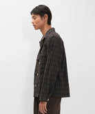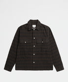 A relaxed fitting shirt, with an open camp collar and hunting inspired front pockets. This shirt jacket is constructed from a light-weight textured cotton blend cloth, which is washed for a casual and soft handfeel. This shirt features a yarn dyed check, side entry front chest pockets with flaps and corozo buttons.