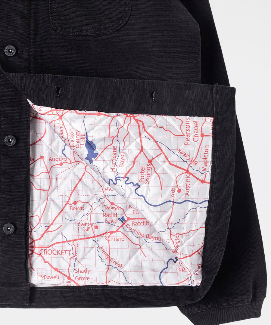 Jakken fremhæver sig med sin kontrasterende needle cord-krave, der tilføjer et sofistikeret touch til det robuste design. Den indvendige foering med 100 gsm quiltet fyld og Crockett map print sikrer både varme og et unikt visuelt element.