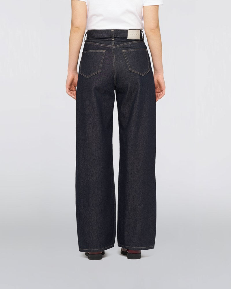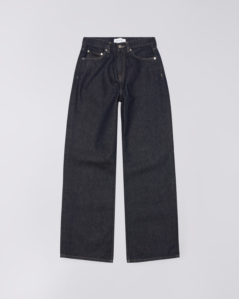 The EDWIN W' Olivia Pant is designed for a feminine silhouette with a relaxed fit, wide legs, and high rise. Made from 14.6oz Arctic Blue Denim (100% cotton), it offers comfort and style with contrast stitching and classic 5-pocket detailing. Finished with a polyurethane patch at the back waistband and sturdy rivets, this pant delivers casual elegance and durability.