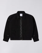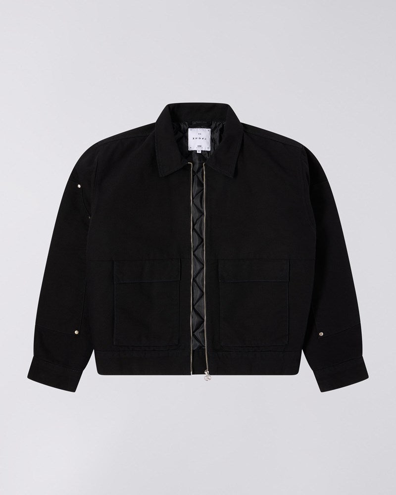 The EDWIN Dogma Work Jacket is a regular fit jacket made from 370g/m² canvas (100% cotton). It features a front zip closure with a personalized zip head, two buttons on each cuff, two patched pockets at the front, workwear patches on the sleeves, and an Edwin tab label on the front pocket.