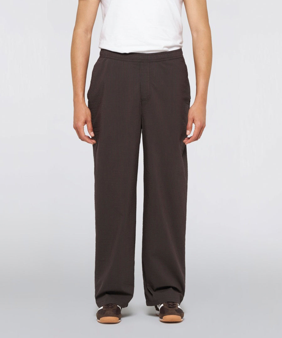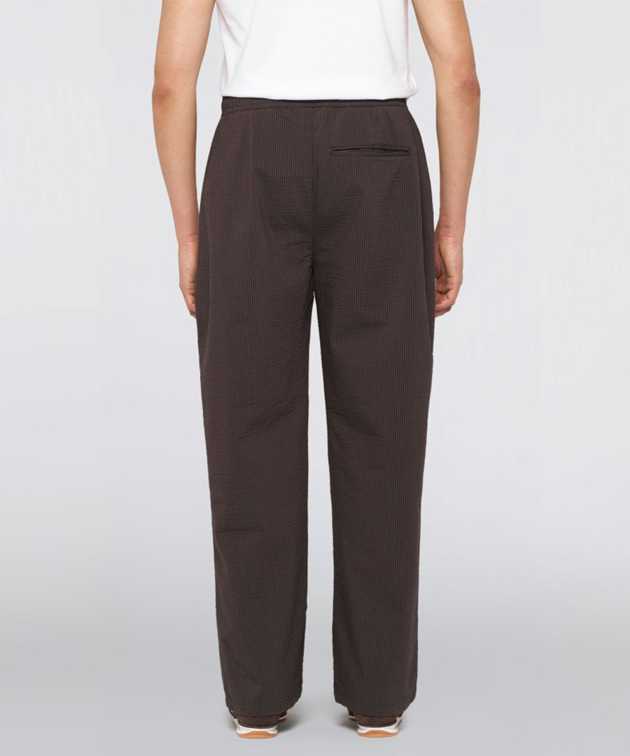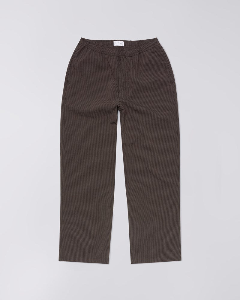 The Edison Pant in Coffee Bean / Black from Edwin combines functional design with contemporary streetwear aesthetics. Sewn in 140g/m² two-tone seersucker with a unique textured surface that provides both visual and tactile expression.