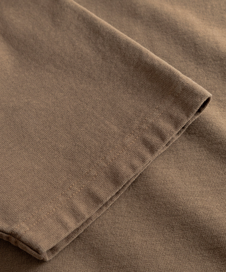 A relaxed garment dyed t-shirt cut from organic midweight dry cotton jersey. It features ribbed binding at the neck, twin needle-stitched edges and cuffs and is finished with a label on the front.