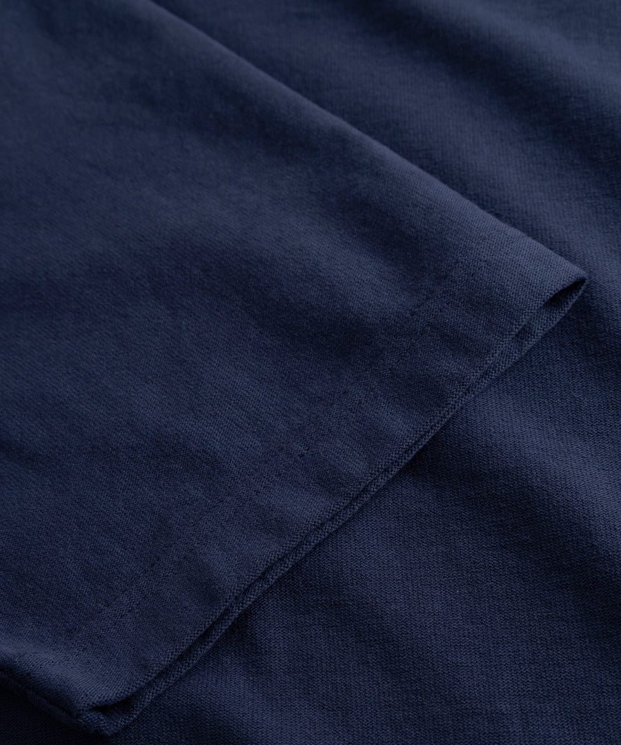 A relaxed garment dyed t-shirt cut from organic midweight dry cotton jersey. It features ribbed binding at the neck, twin needle-stitched edges and cuffs and is finished with a label on the front.