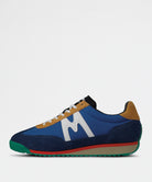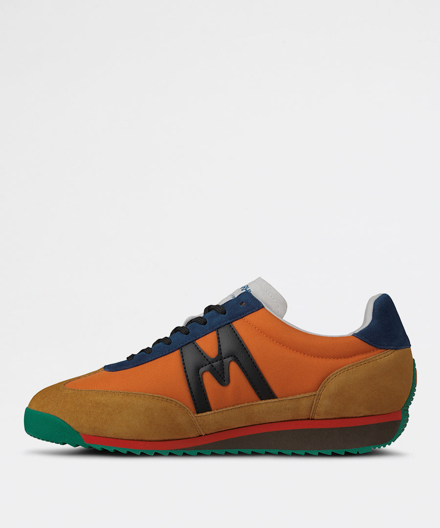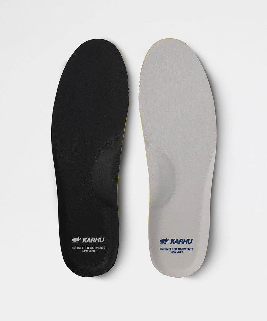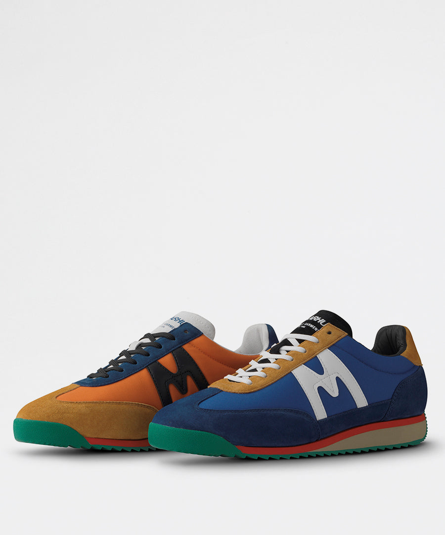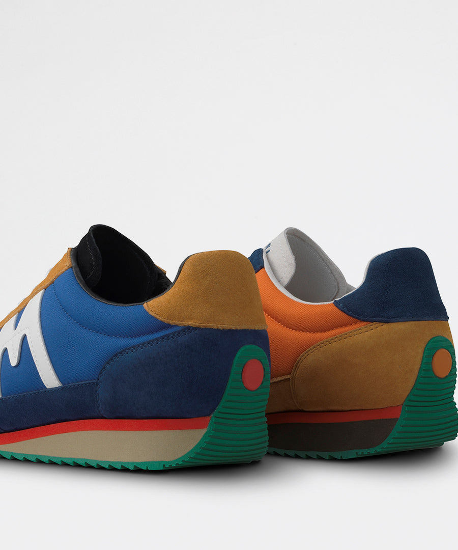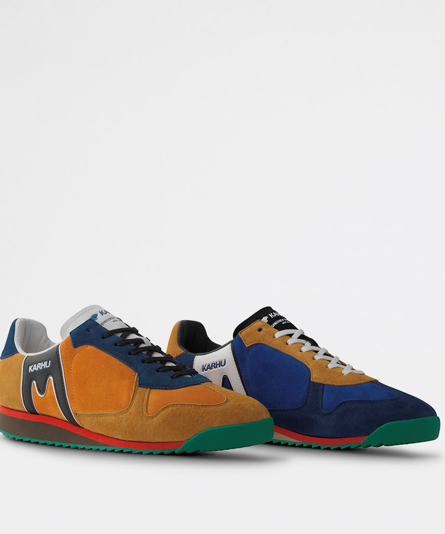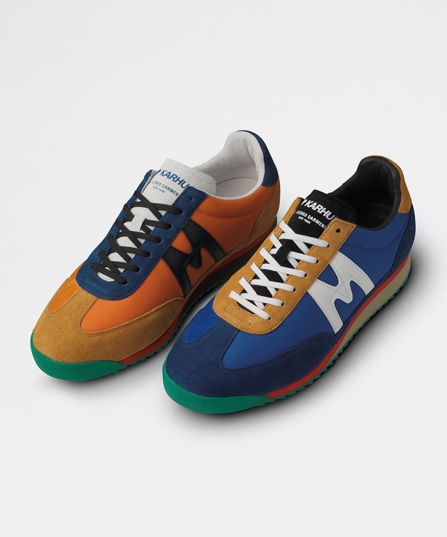 KARHU and Engineered Garments reunite for the brand-new KARHU x Engineered Garments Mestari Sprint in Classic Blue / Jaffa Orange. It's their second collaboration. Drawing from KARHU’s rich archive, the shoe seamlessly merges the iconic Mestari running shoe with KARHU’s cross-country skiing shoe, the Sprint, in an eye-catching and asymmetric design. This partnership offers a bold reinterpretation of KARHU’s heritage, blending past and present with Engineered Garment’s signature craftsmanship.