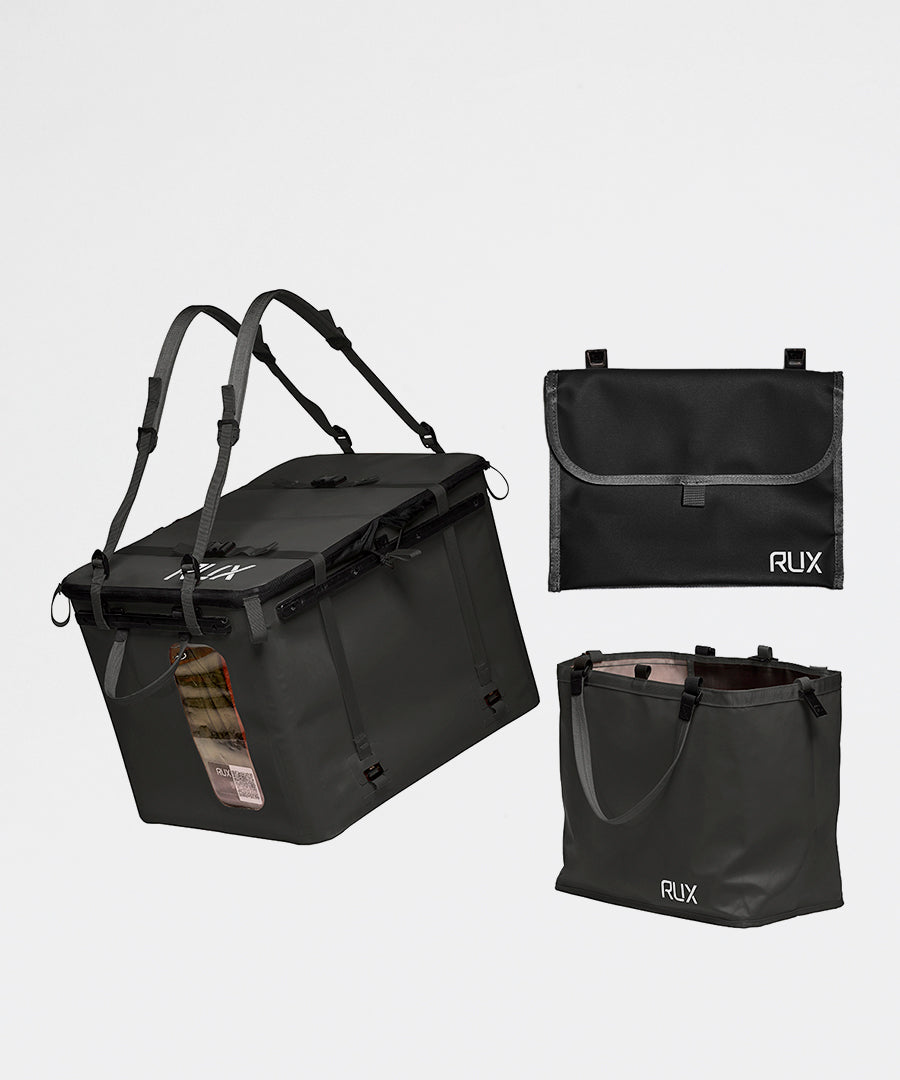 RUX Essentials Set er en tre-i-en-løsning, der tilbyder fleksibel opbevaring til udendørs aktiviteter og rejser. Dette sæt giver dig mulighed for at organisere dit udstyr effektivt med komponenter, der kan bruges individuelt eller kombineres.